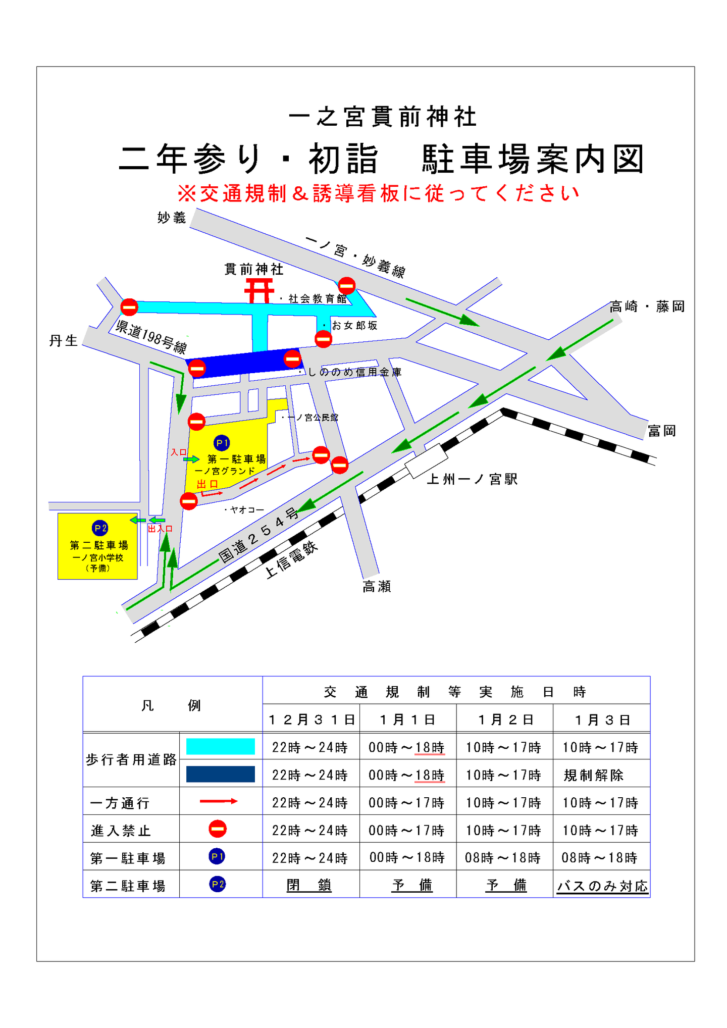 12/31から1/3までの期間は富岡警察による交通規制が敷かれ、臨時の駐車場が設営されます。